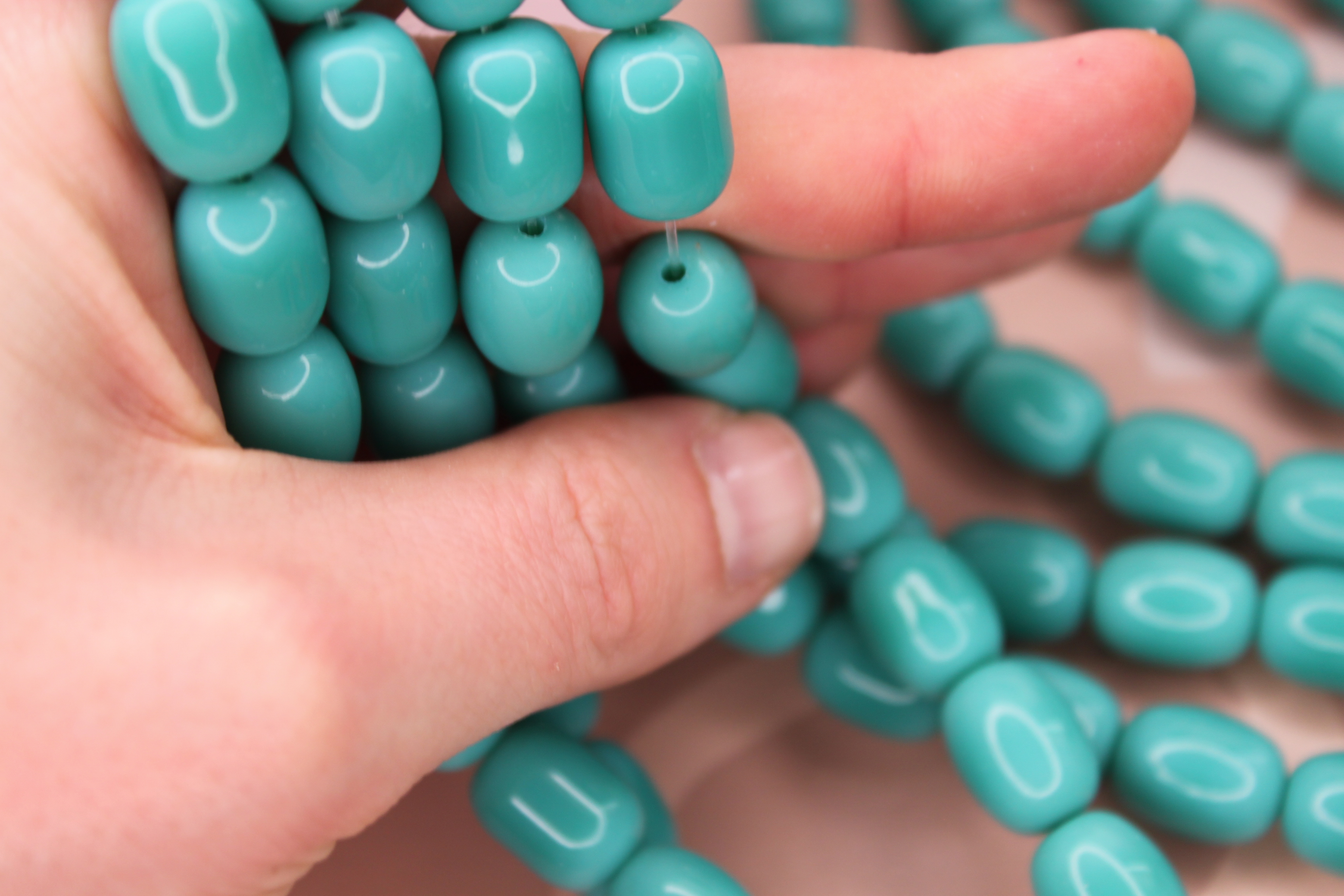 Бусины бочонки стекло бирюза 9х13 мм(нить 38 см)